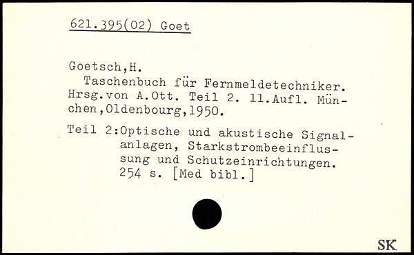 Taschenbuch fur Fernmeldetechniker Hrsg.von A.Ott. Teil 2. ll.Aufl. Mûri chen,Oldenbourg,1950. Teil 2 : Optische und akustische Signalanlagen, Starkstrombeeinflussung und Schutzeinrichtungen