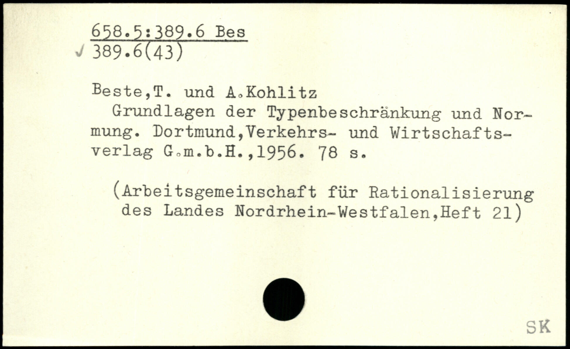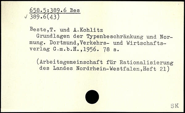 Beste,T. und A^Kohlitz Grundlagen der Typenbeschränkung und Normung. Dortmund,Verkehrs- und Wirtschaftsverlag G,m.b.H.,1956.