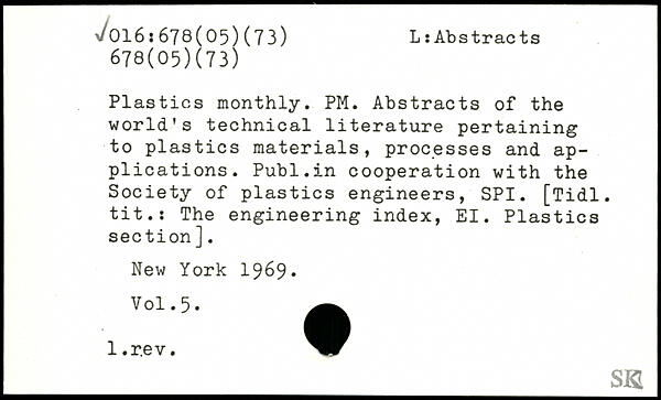 Plastics monthly. PM. Abstracts of the world’s technical literature pertaining to plastics materials, processes and applications. Publ.in cooperation with the Society of plastics engineers, SPI. [Tidl. tit.: The engineering index, El. Plastics section ].