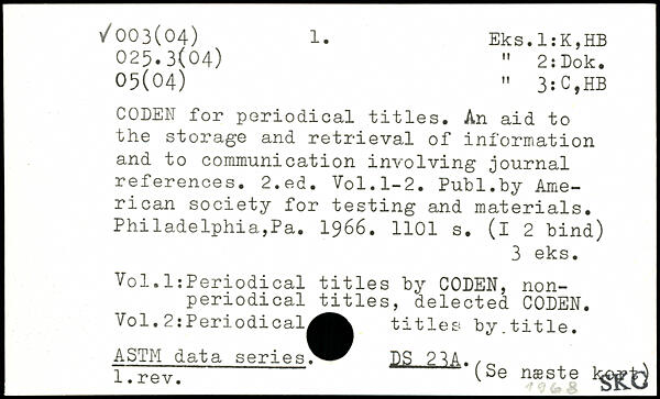 CODEN for periodical titles. An aid to the storage and retrieval of information and to communication involving journal references.