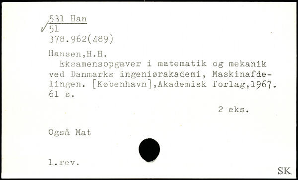 Eksamensopgaver i matematik og mekanik ved Danmarks ingeniørakademi, Maskinafdelingen. [København],Akademisk forlag,1967.
