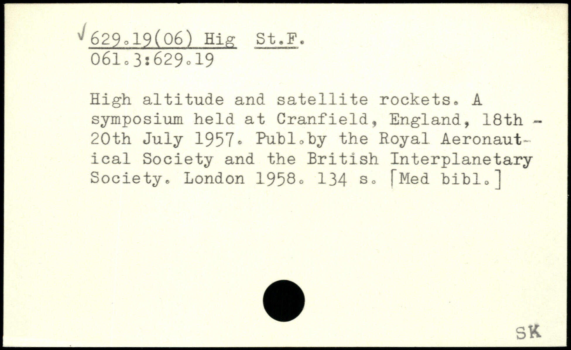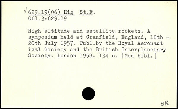 High altitude and satellite rockets. A symposium held at Cranfield, England, 18th -20th July 1957, Puhlohy the Royal Aeronautical Society and the British Interplanetary Society.