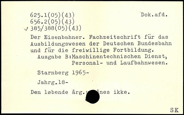 Der Eisenbahner. Fachzeitschrift für das Ausbildungswesen der Deutschen Bundesbahn und für die freiw1111ge Fortbildung. Ausgabe B:Maschinentechnischen Dienst) Personal- und Laufbahnwesen. Starnberg 19&5- Jahrg.18- Den lobende arg.^^^nes ikke.