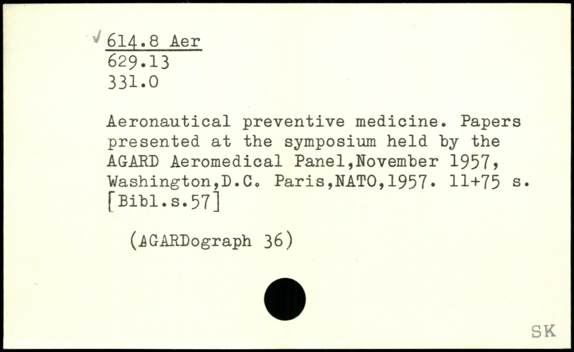 Aeronautical preventive medicine. Papers presented at the symposium held by the AGARD Aeromedical Panel,November 1957> Washington,P.G.