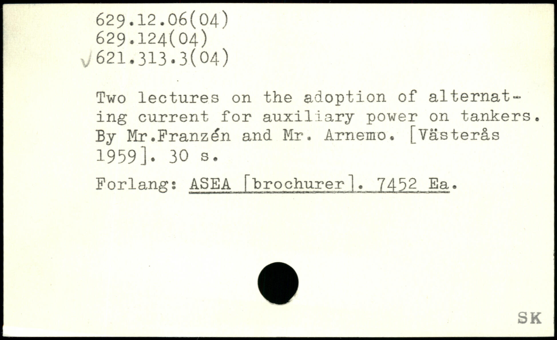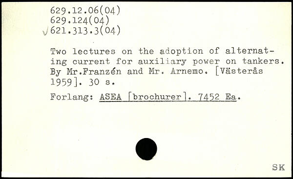 Two lectures on the adoption of alternating current for auxiliary power on tankers. By Mr.Franzén and Mr. Arnerno. [Vasterås 1959].