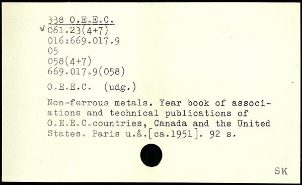 Non-ferrous metals. Year book of associations and technical publications of O.E0E.Co countries, Canada and the United States. Paris u,a,[ca.1951].