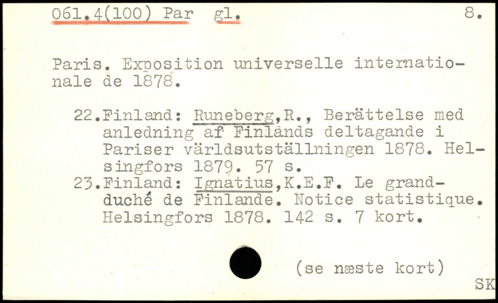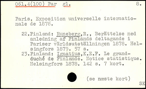 Paris. Exposition universelle internationale de 1878. 22.Finland: Runeberg,H., Berättelse med anledning af Finlands deltagande i Pariser världsutställningen 1878.