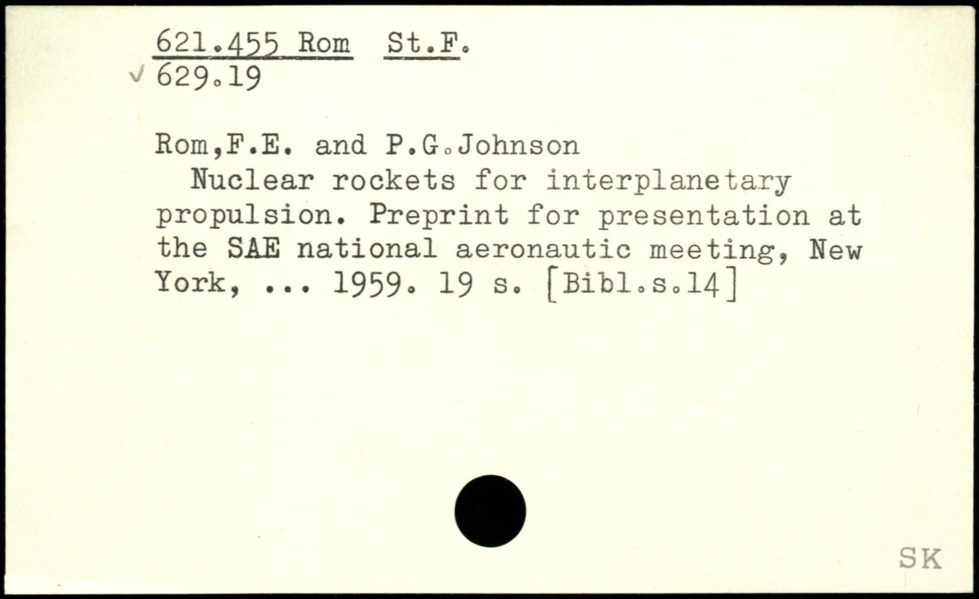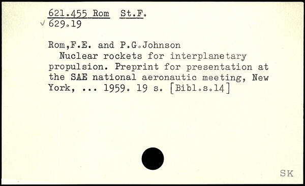 Nuclear rockets for interplanetary propulsion. Preprint for presentation at the SAE national aeronautic meeting, New York, ... 1959.