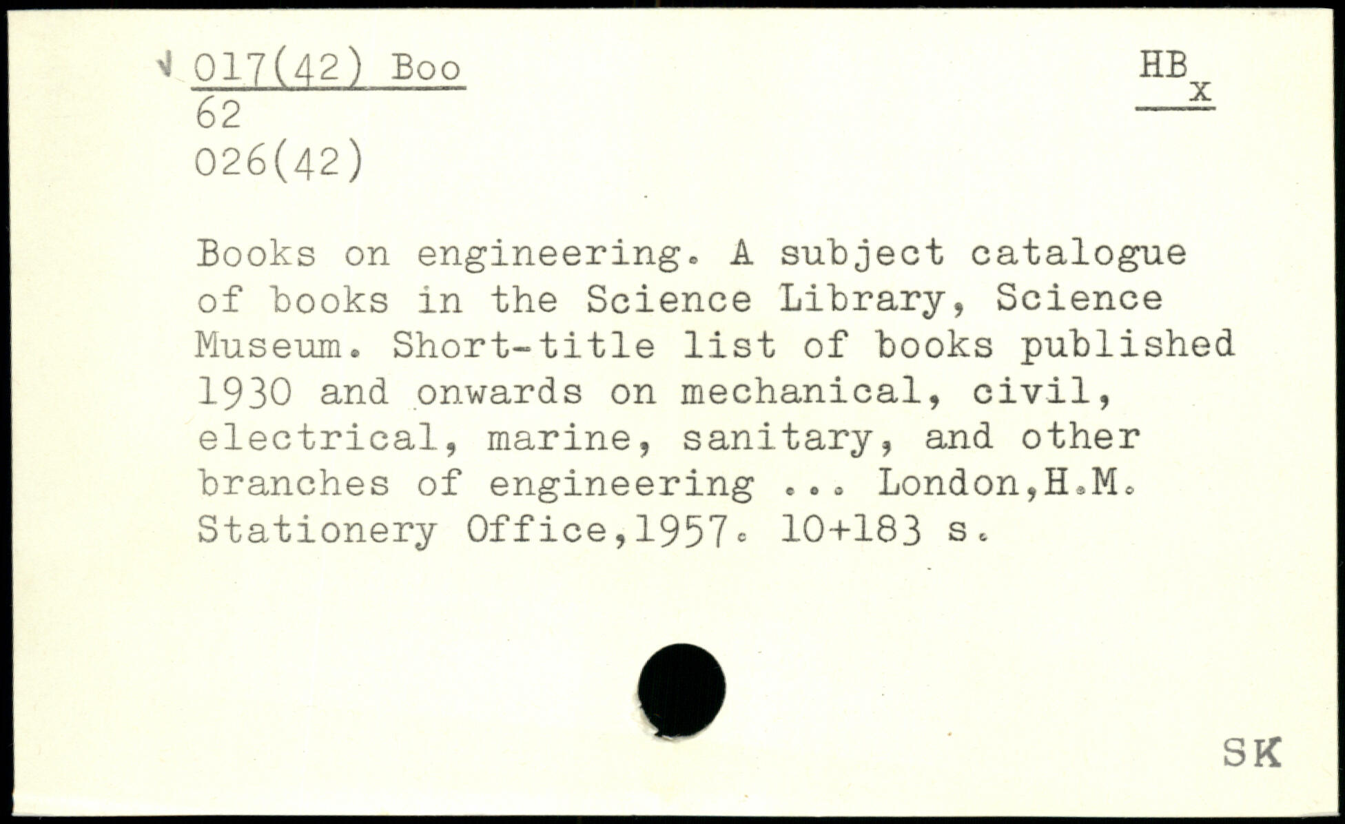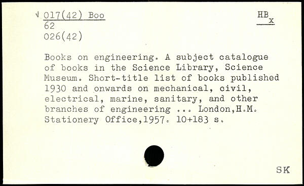 Books on engineering. A subject catalogue of books in the Science Library, Science Museum. Short-title list of books published 1930 and onwards on mechanical, civil, electrical, marine, sanitary, and other branches of engineering ...