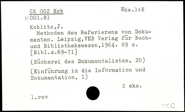 Methoden des Referierens von Dokumenten. Leipzig,VEB Verlag für Buch-und Bibliothekswesen,1964.