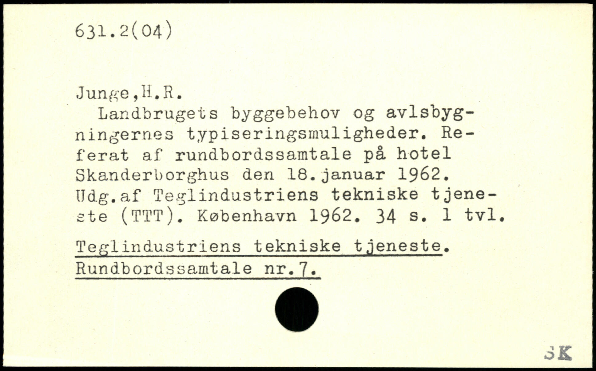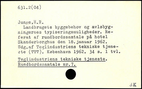 Landbrugets byggebehov og avlsbygningernes typiseringsmuligheder. Referat af rundbordssamtale på hotel Skanderborghus den 18.januar 1962. TTdg.af Teglindustriens tekniske tjeneste (TTT).