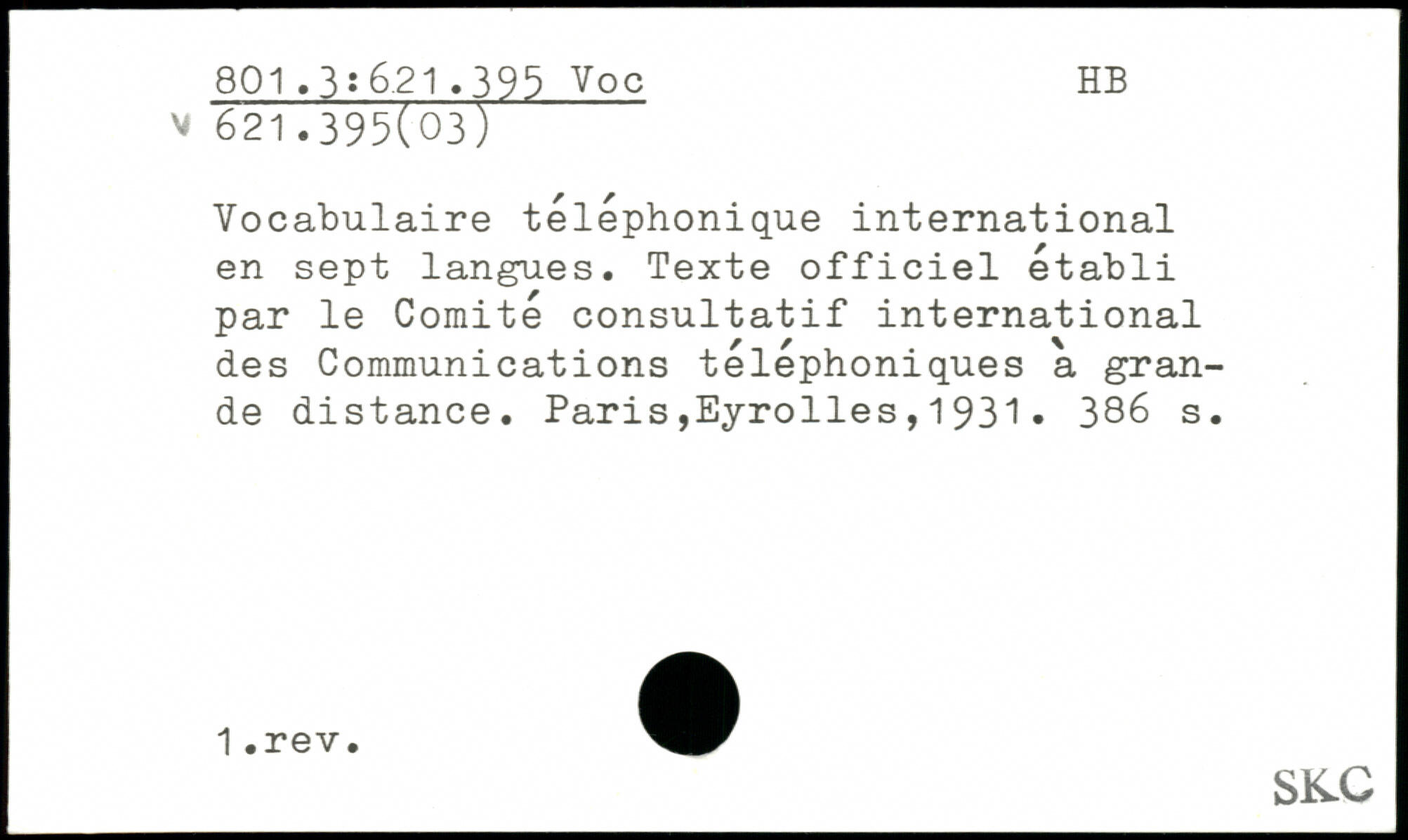 Vocabulaire téléphonique international en sept langues. Texte officiel établi par le Comité consultatif international des Communications téléphoniques a grande distance.