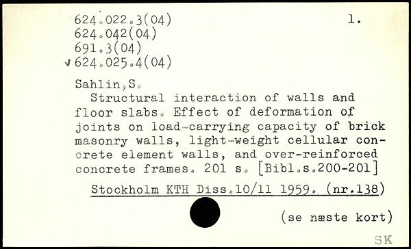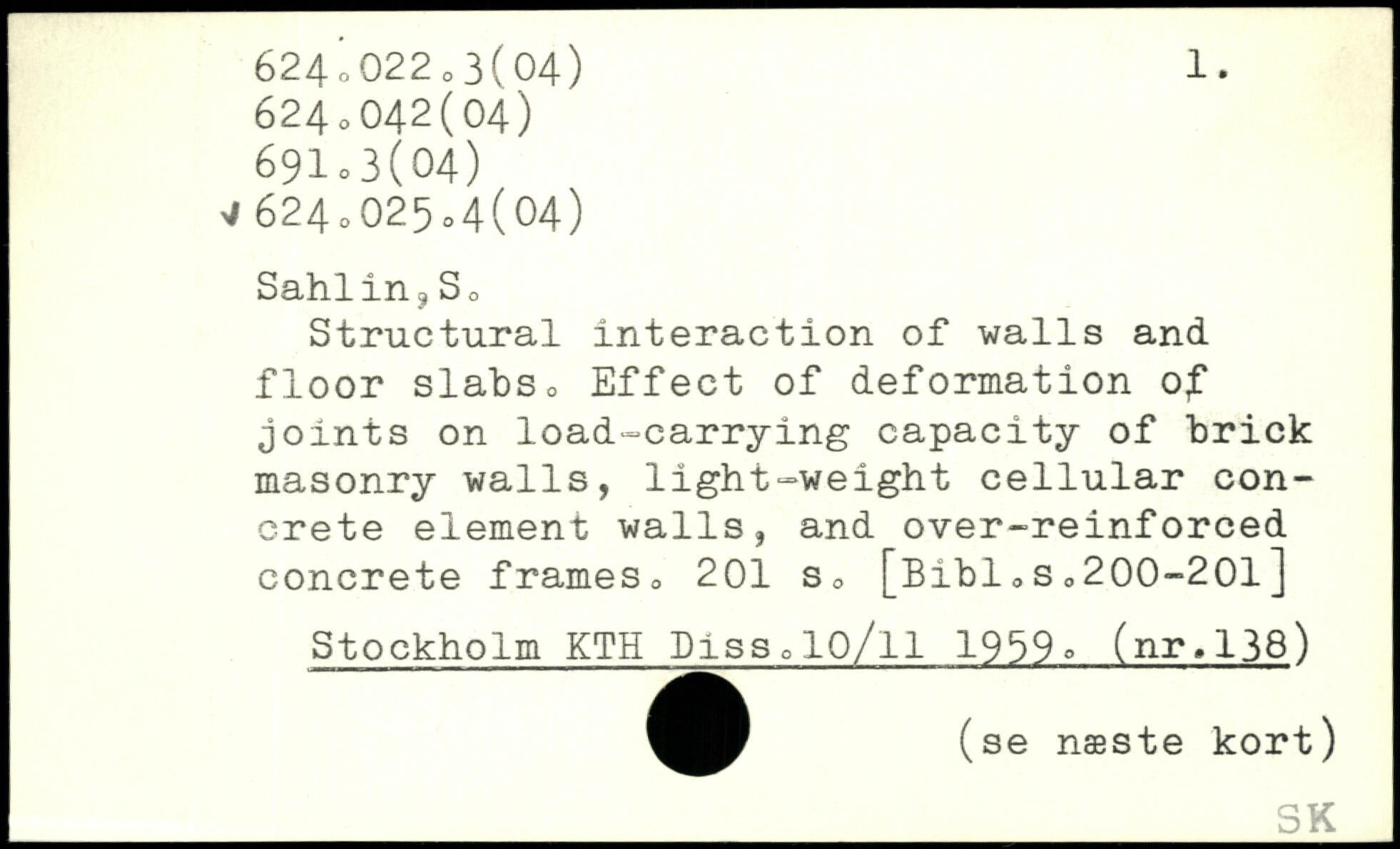 Sahl in? S. Structural interaction of walls and floor slabs. Effect of deformation of joints on load-carrying capacity of brick masonry walls, light-weight cellular concrete element walls, and over-reinforced concrete frames.