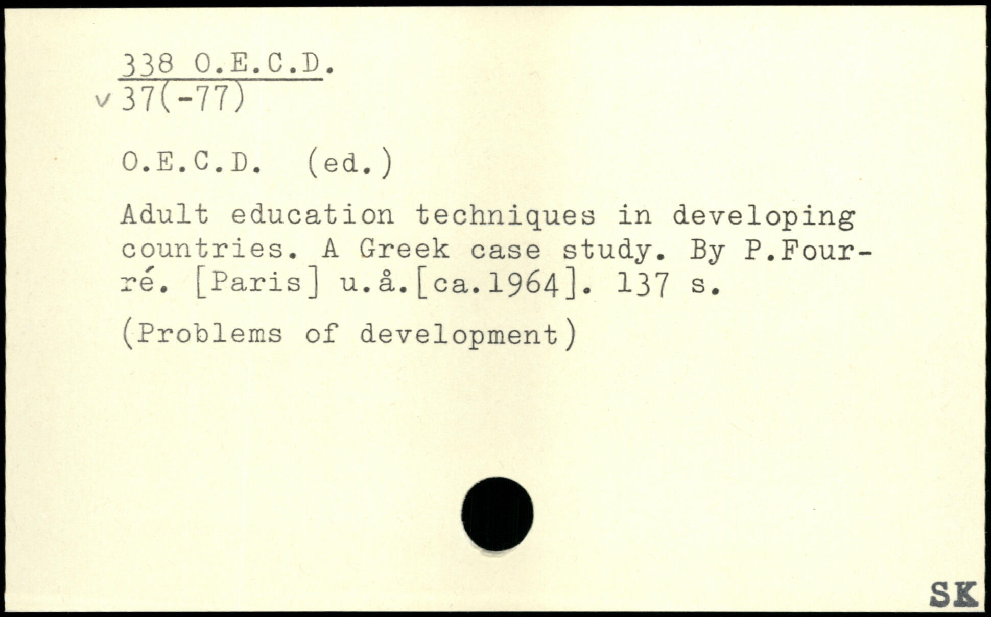 Adult education techniques in developing countries. A Greek case study. By P.Four-re. [Paris] u.a.[ca.1964].