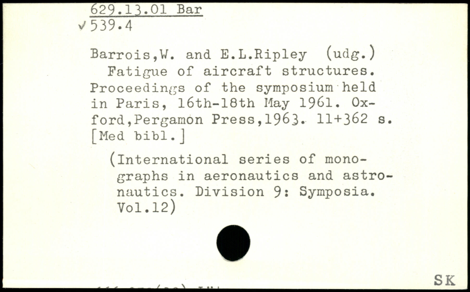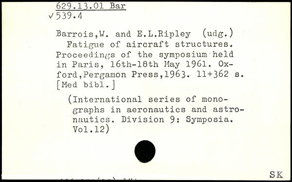 Fatigue of aircraft structures. Proceedings of the symposium held in Paris, l6th-18th May 1961.
