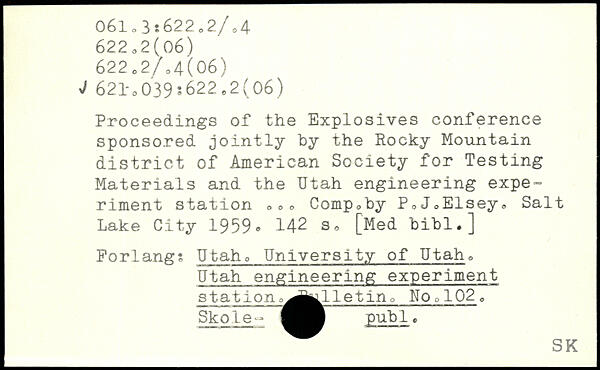 Proceedings of the Explosives conference sponsored jointly by the Rocky Mountain district of American Society for Testing Materials and the Utah engineering expe~ riment station 0 0 0 Comp0by P,J0Elsey<, Salt Lake City 1959