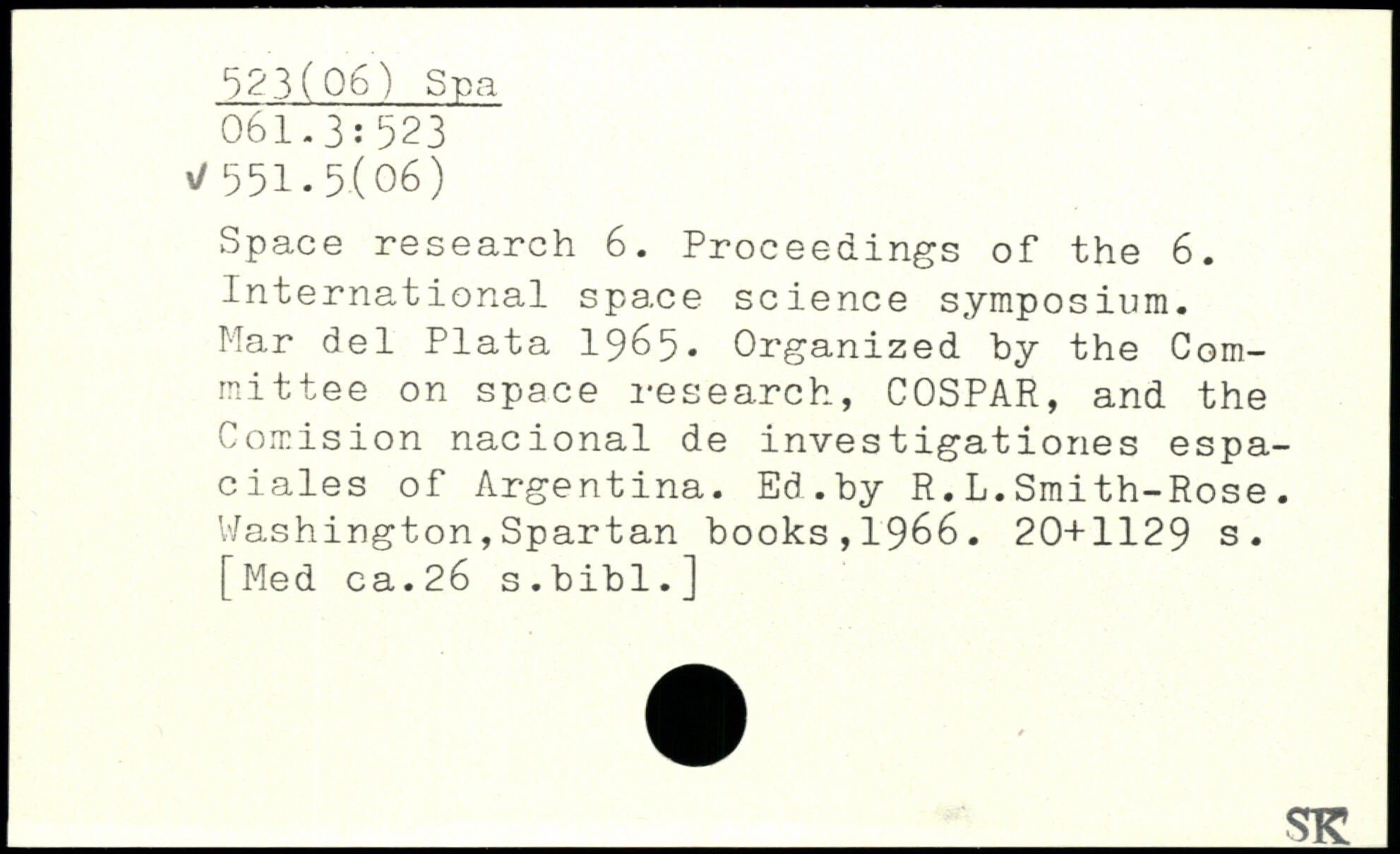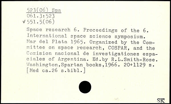 Space research 6. Proceedings of the 6. Internetional space science symposium. Mar del Plata 1965. Organized by the Com- i mittee on space research, COSPAR, and the j Comision nacional de investigationes espa-ciales of Argentina. Ed.by R.L.Smith-Rose.