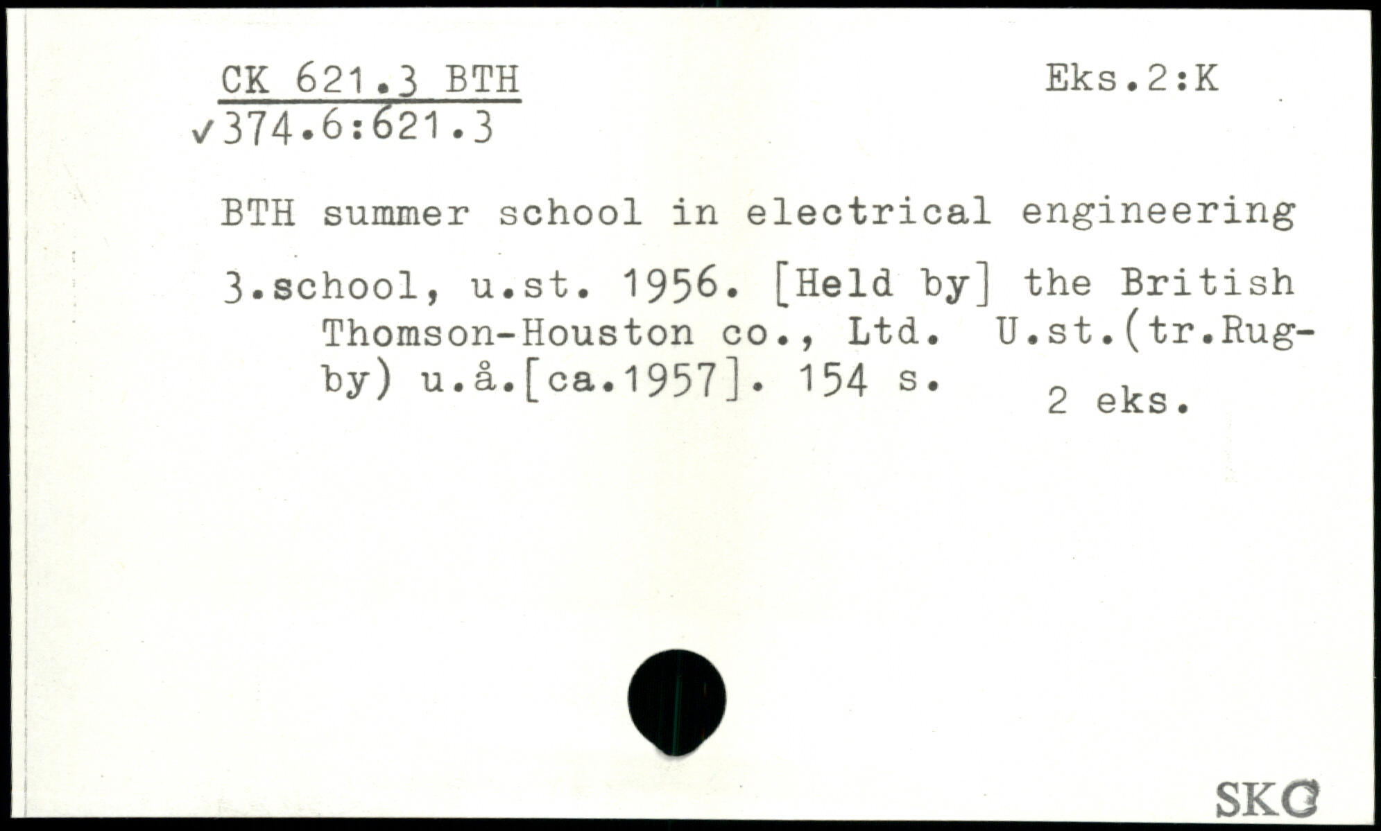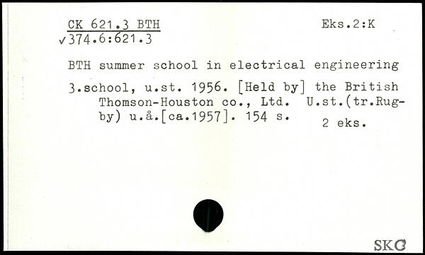 BTH summer school in electrical engineering 3.school, u.st. 1956. [Held by] the British Thomson-Houston co., Ltd. U.st.(tr.Rugby) u.a.[ca.1957].