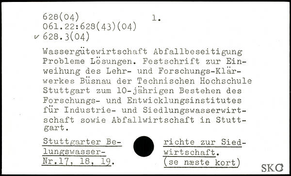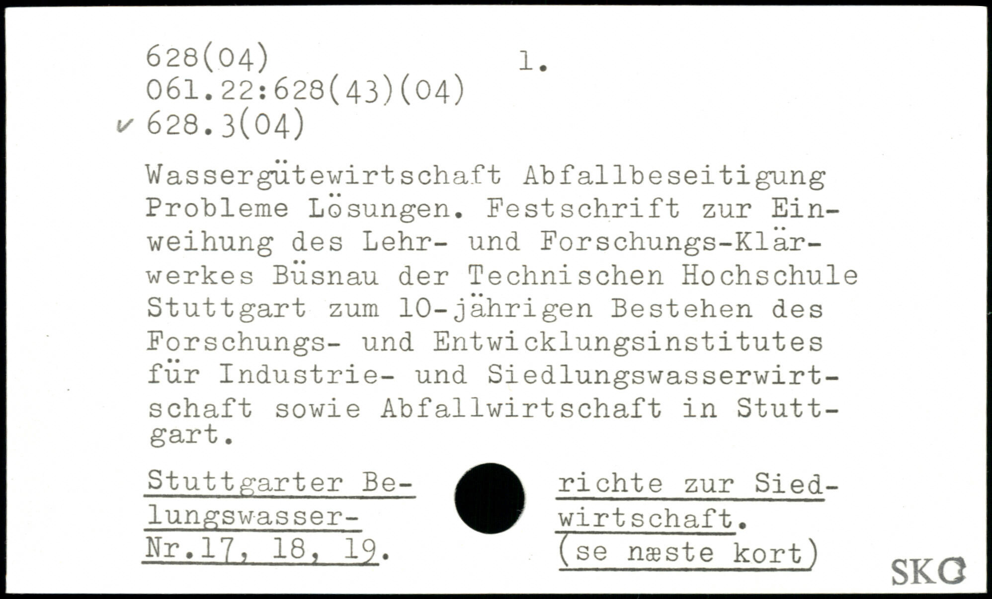 Wassergutewirtschaft Abfallbeseitigung Probleme Losungen. Festschrift zur Einweihung des Lehr- und Forschungs-Klärwerkes Büsnau der Technischen Hochschule Stuttgart zum 10-jährigen Bestehen des Forschungs- und Entwicklungsinstitutes für Industrie- und Siedlungswasserwirtschaft sowie Abfallwirtschaft in Stuttgart. Stuttgarter Be- richte zur Siedlungswasser- Wirtschaft. Nr, 17, 18, 19. (se næst~ë~kort)