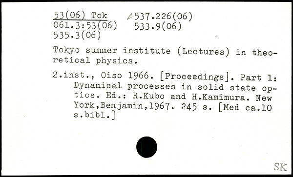 Tokyo summer institute (Lectures) in theo-retical physics. 2.inst., Oiso 1966. [ProceedingsJ. Part 1. Dynamical processes in solid state optics. Ed.: R.Kubo and H.Kamimura.