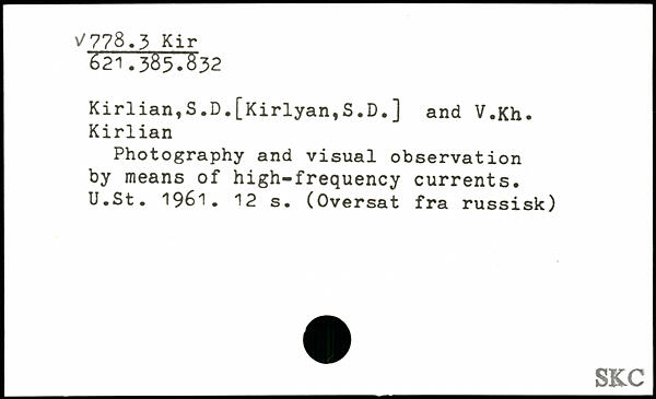 Kirlian,S.D.[Kirlyan,S.D.] and V.Kh. Kirlian Photography and visual observation by means of high-frequency currents. U.St. 1961.