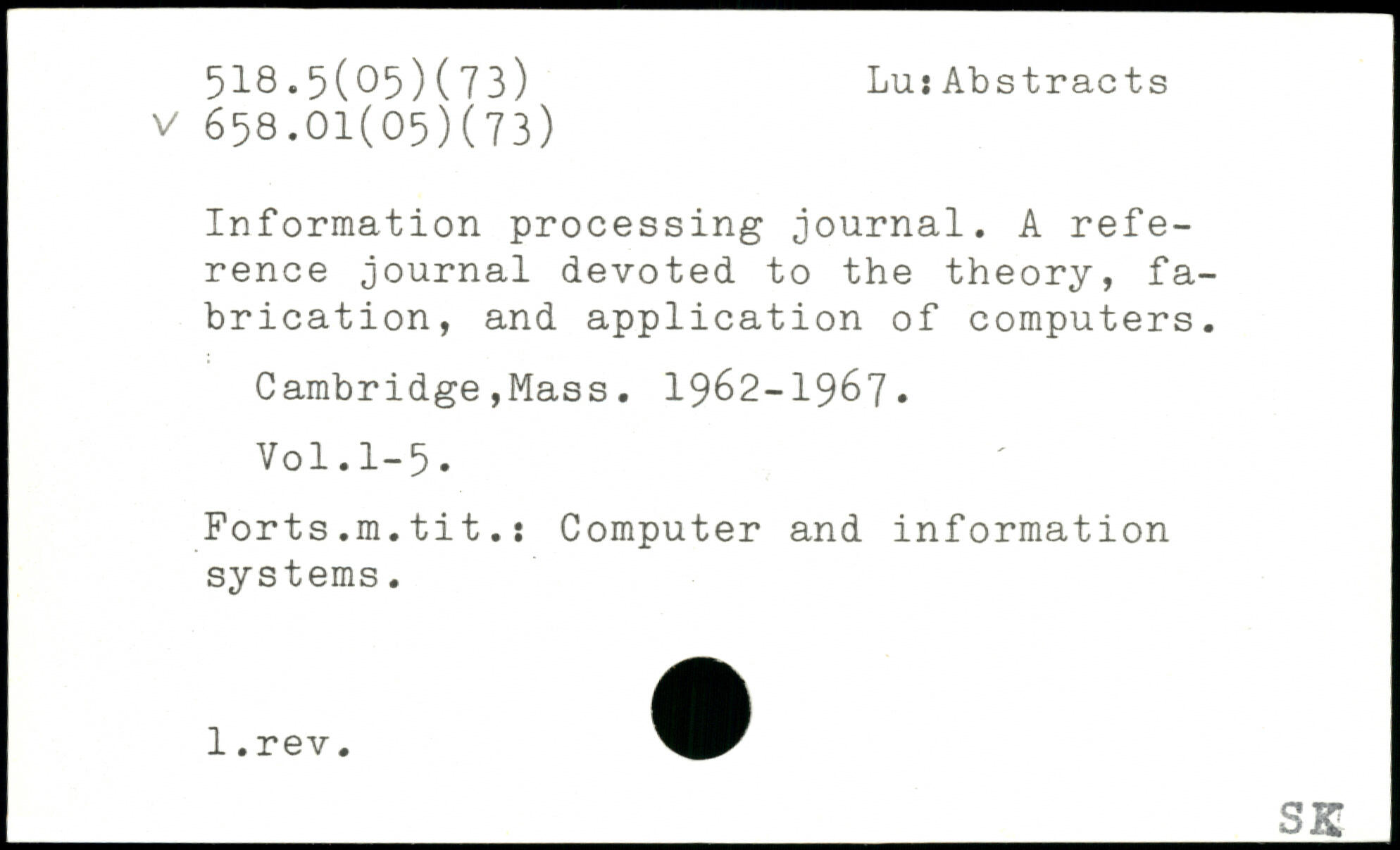 Information processing journal. A reference journal devoted to the theory, fabrication, and application of computers. Cambridge,Mass. 1962-1967.