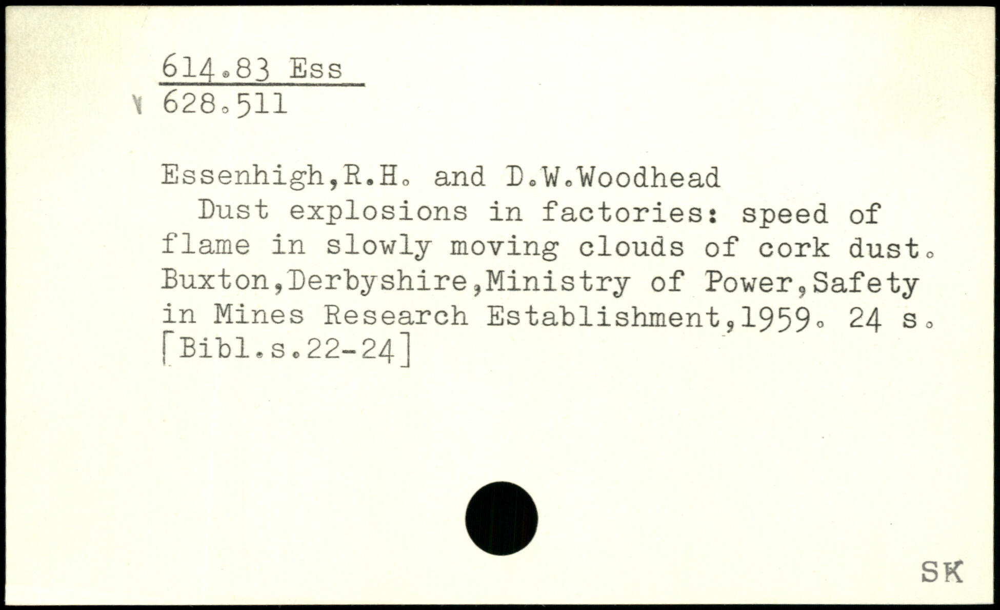 Dust explosions in factories: speed of flame in slowly moving clouds of cork dusto Buxton,Derbyshire,Ministry of Power,Safety in Mines Research Establishment,1959