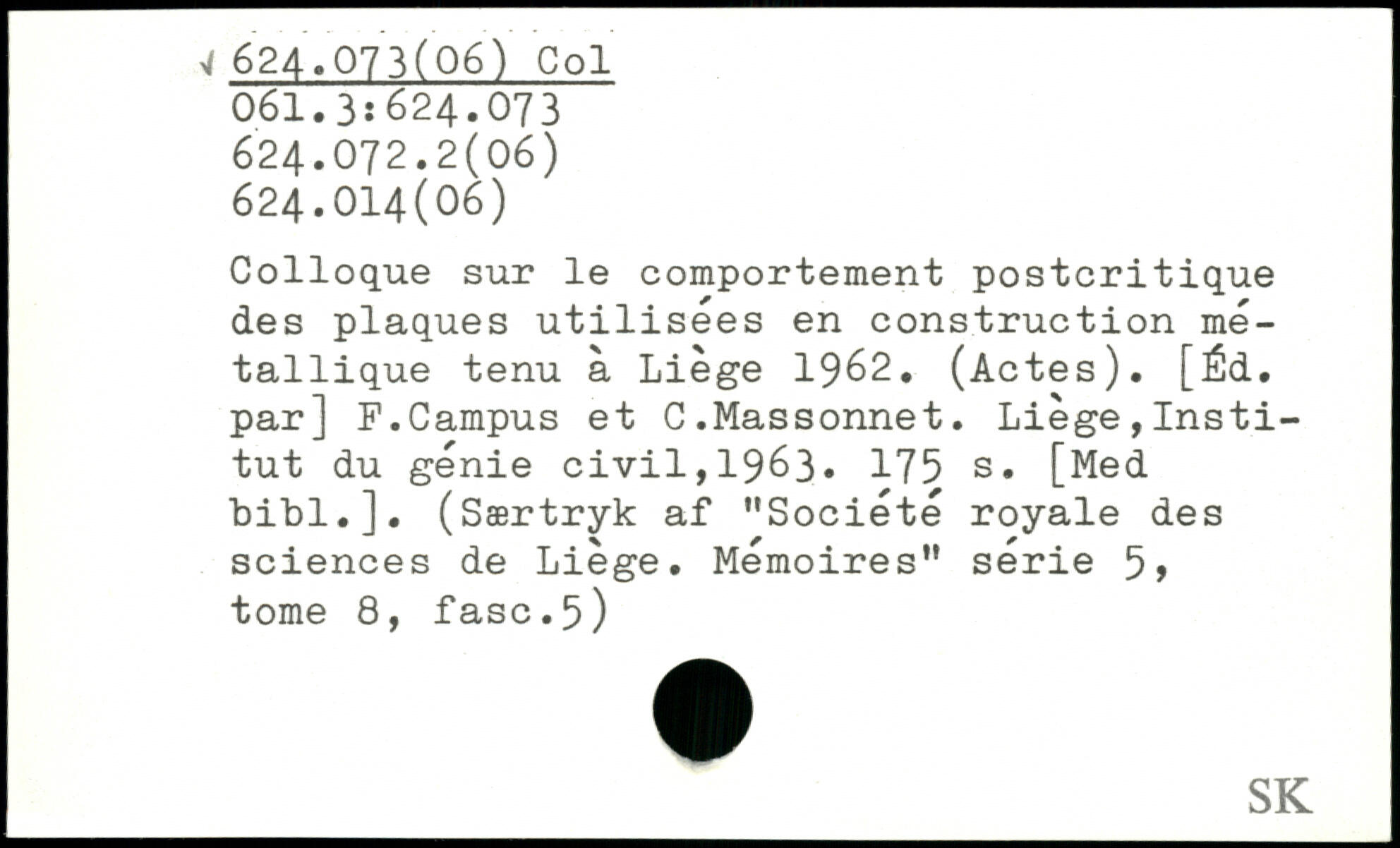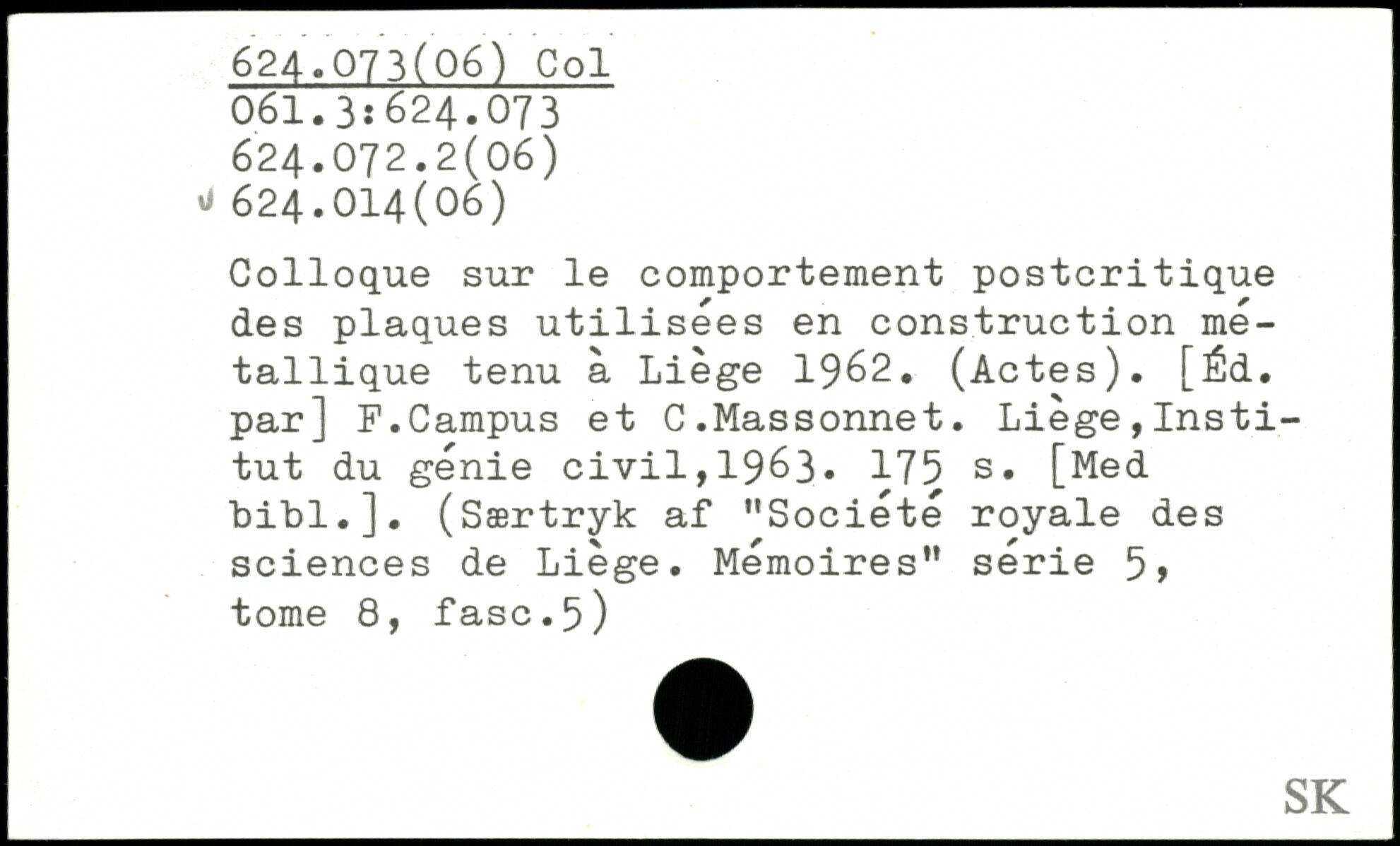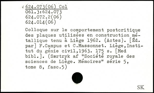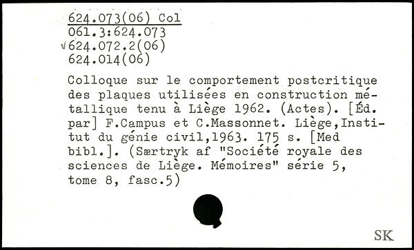 Colloque sur le comportement postcritique des plaques utilisées en construction métallique tenu à Liège 1962. (Actes). [Éd. par] F.Campus et C.Massonnet. Liège,Institut du génie civil,1963.