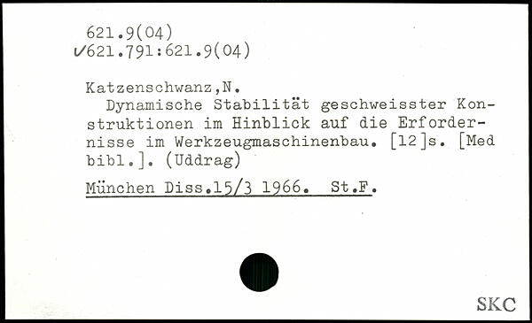 Dynamische Stabilität geschweisster Konstruktionen im Hinblick auf die Erfordernisse im Werkzeugmaschinenbau. [l2]s. [Med bibl.]. (üddrag) München Piss.15/3 1966. St.F.