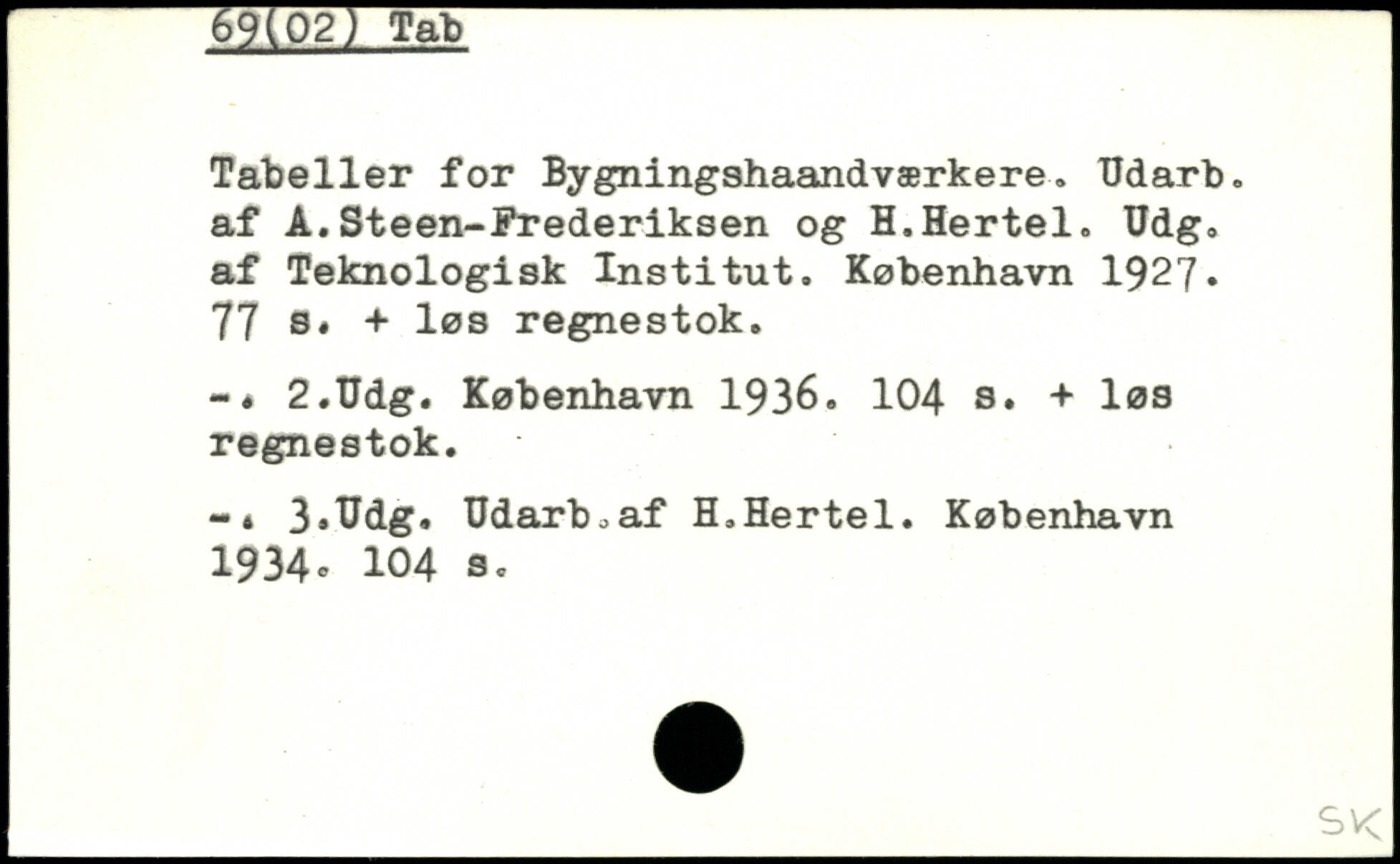 Tabeller for Bygningshaandværkere. tfdarb. af A.Steen-Frederiksen og H.Hertel. Udg. af Teknologisk Institut.