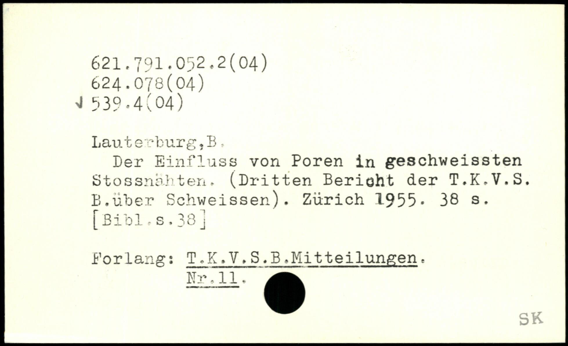 Der Einfluss von Poren in geschweissten Stossnähten, (Dritten Berioht der T.K-V.S. B.über Schweissen). Zürich 1955.