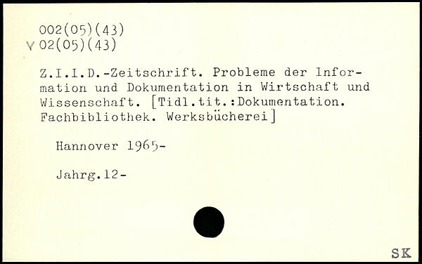 Z.I.l.D.-Zeitschrift. Probleme der Information und Dokumentation in Wirtschaft und Wissenschaft. [Tidl.tit.:Dokumentation. Fachbibliothek. Werksbucherei] Hannover 196.)- Jahrg.12-