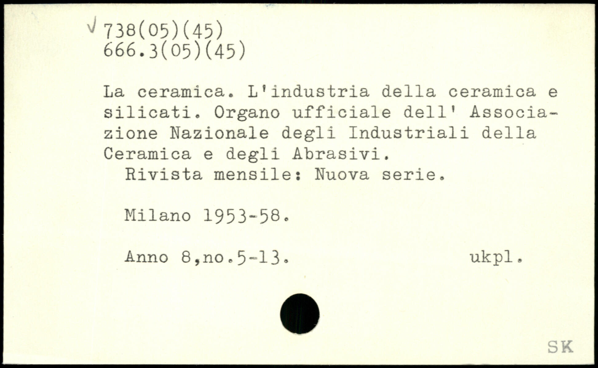La ceramica. L'industria della ceramica e silicati. Organo ufficiale dell’ Associa-zione Nazionale degli Industrial! della Ceramica e degli Abrasivi. Rivista mensile: Nuova serie. Milano 1953-58. Anno 8,no.5“13. ukpl.