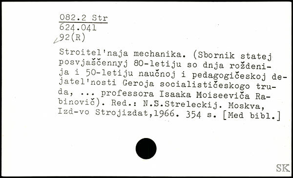 Stroitel1na ja mechanika. (Sbornik statej posvjascennyj 80-letiju so dnja rozdeni-ja i 50-letiju naucnoj i pedagogiceskoj de-jatel'nosti Geroja socialisticeskogo tru-d-aj ... professora Isaaka Moiseevica Ra-binovic). Red.: N.S.Streleckij.