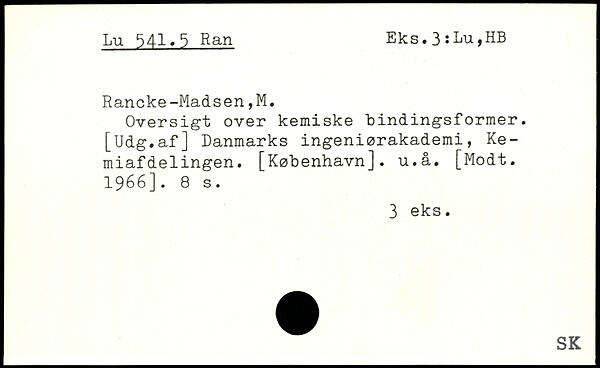 Oversigt over kemiske Bindingsformer. [Udg.af] Danmarks ingeniørakademi, Kemiafdelingen. [København], u.å. [Modt. 1966].