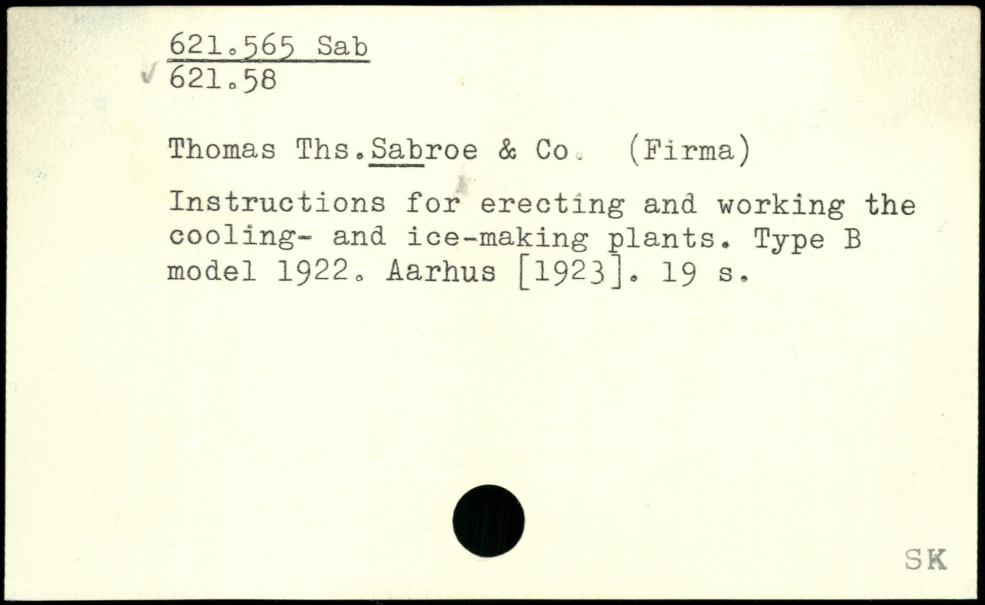 Thomas Ths-Sabroe & Co. (Firma) Instructions for erecting and working the cooling- and ice-making plants. Type B model 19220