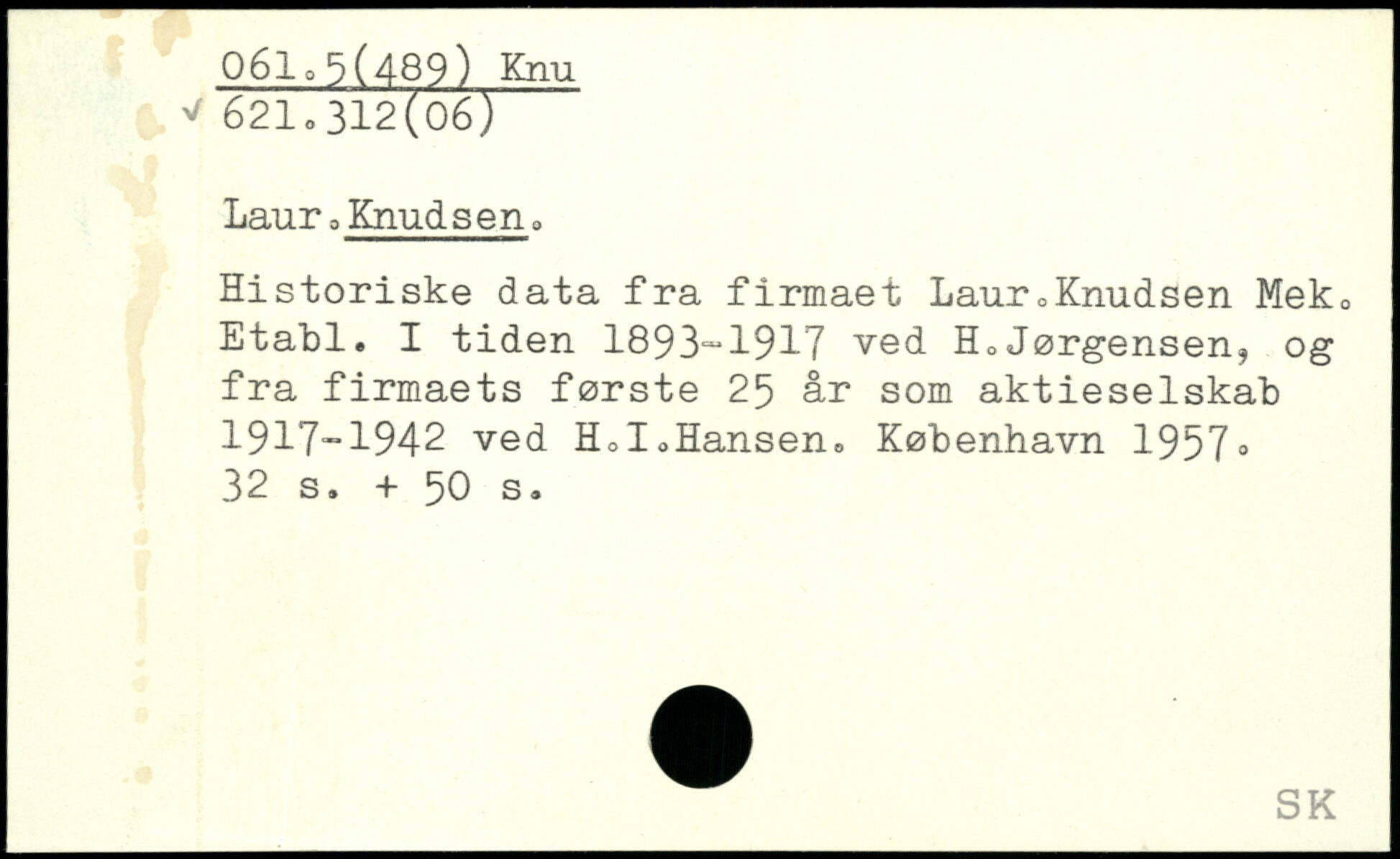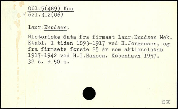 Laur 3Knudsen0 Historiske data fra firmaet Laur,Knudsen Meko Etabi. I tiden 1893-1917 ved H0Jørgensen? og fra firmaets første 25 år som aktieselskab 1917-1942 ved HdoHansen.