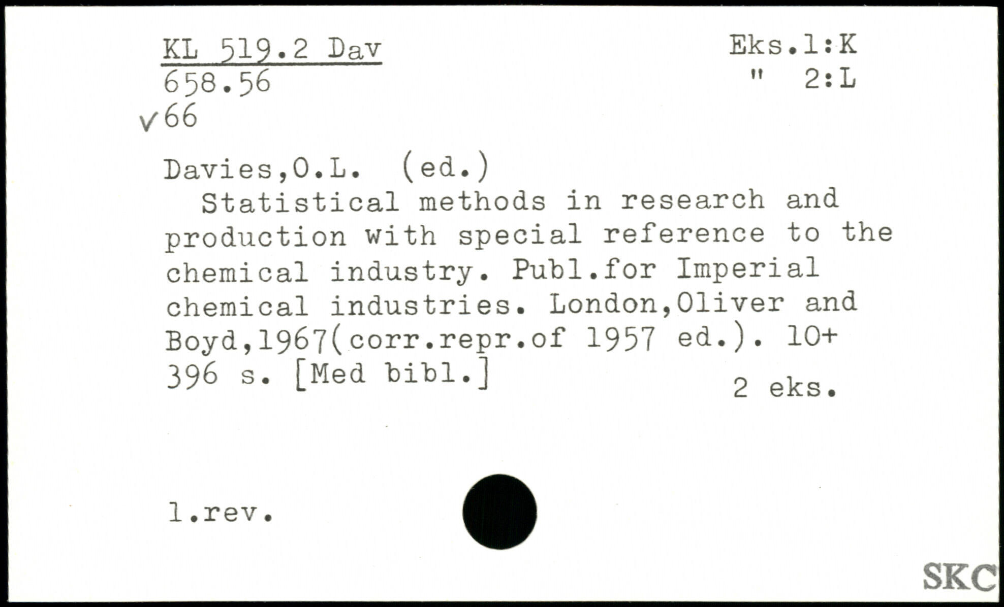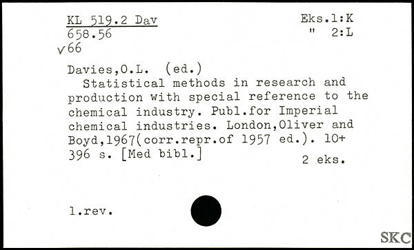 Statistical methods in research and production with special reference to the chemical industry. Puhl.for Imperial chemical industries.