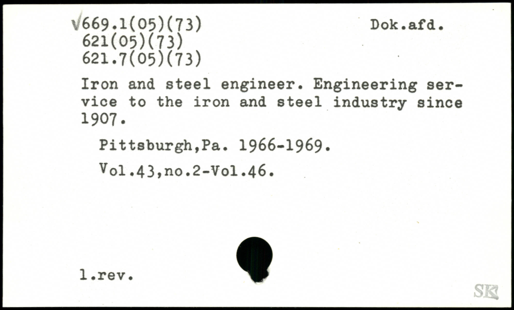 Iron and steel engineer. Engineering service to the iron and steel industry since 1907. Pittsburgh,Pa. 1966-1969.