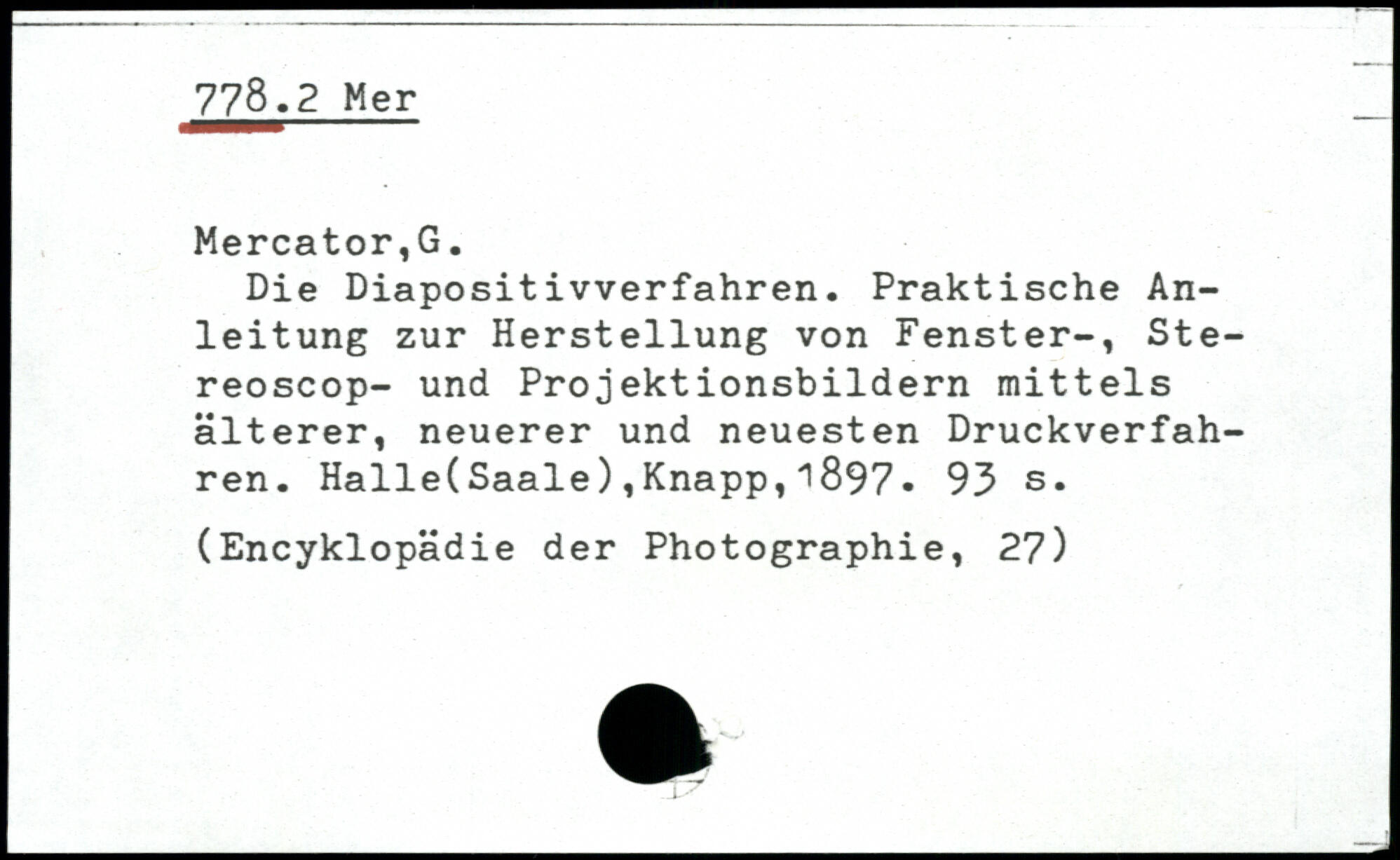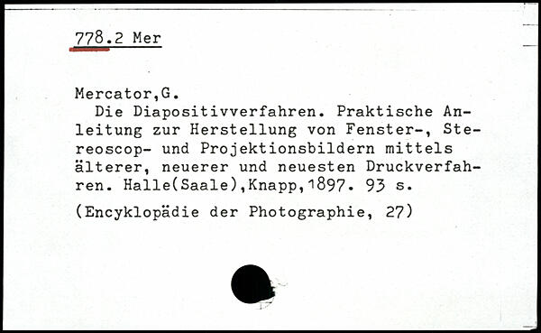 Die Diapositivverfahren. Praktische Anleitung zur Herstellung von Fenster-, Stereoscop- und Projektionsbildern mittels älterer, neuerer und neuesten Druckverfahren. Halle(Saale),Knapp,1897.