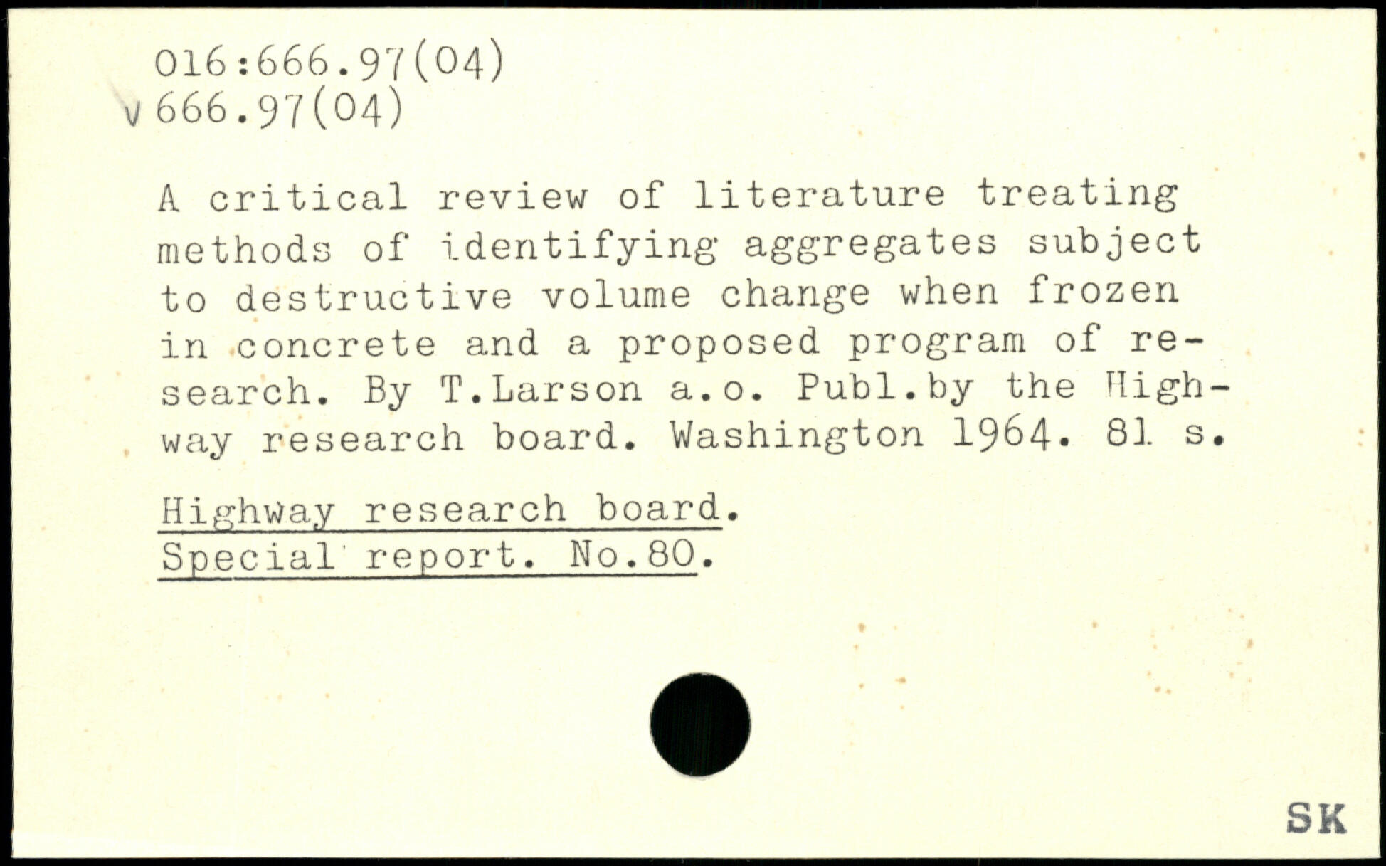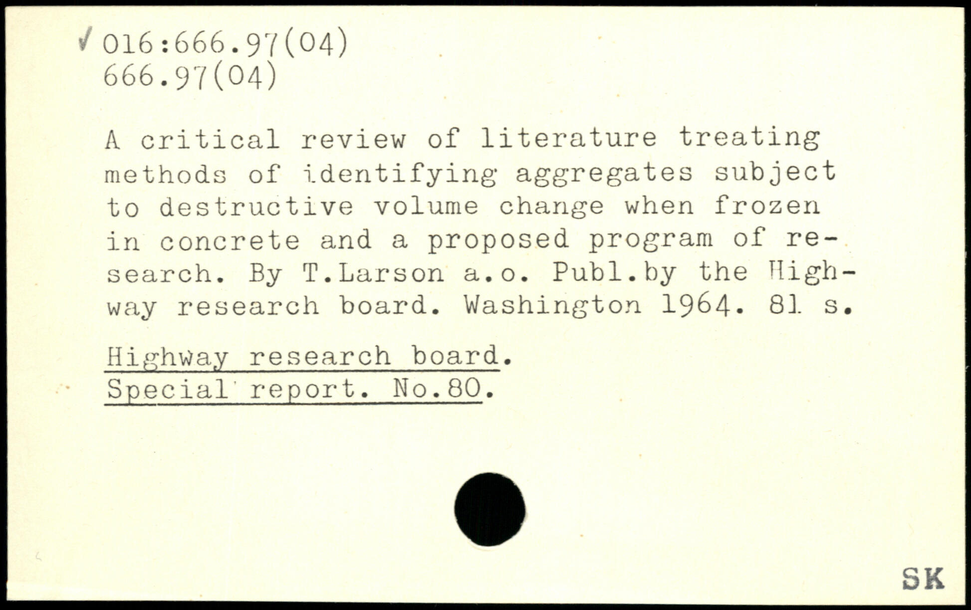 A critical review of literature treating methods of identifying aggregates subject to destructive volume change when frozen in concrete and a proposed program of research. By T.Larson a.o.