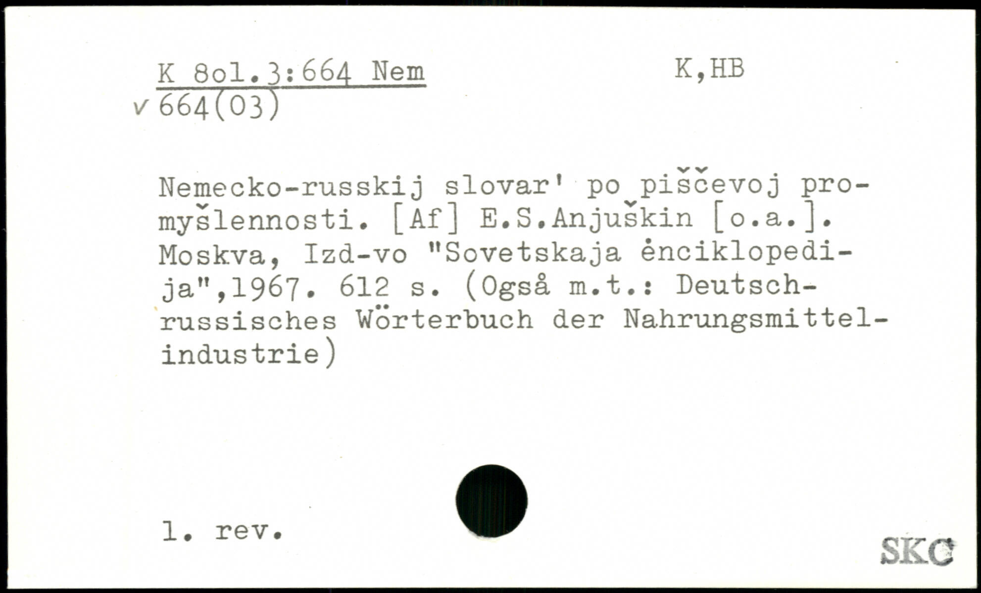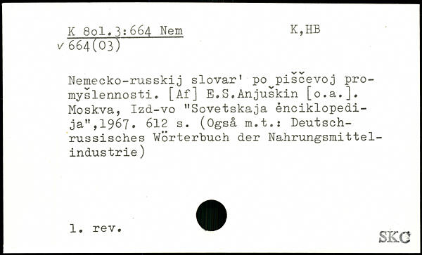 Nemecko-russkij slovar. po piscevoj pro-myslennosti. [Af] E.S.Anjuskin Moskva, Izd-vo "Sovetskaja enciklopedi-ja",1967.
