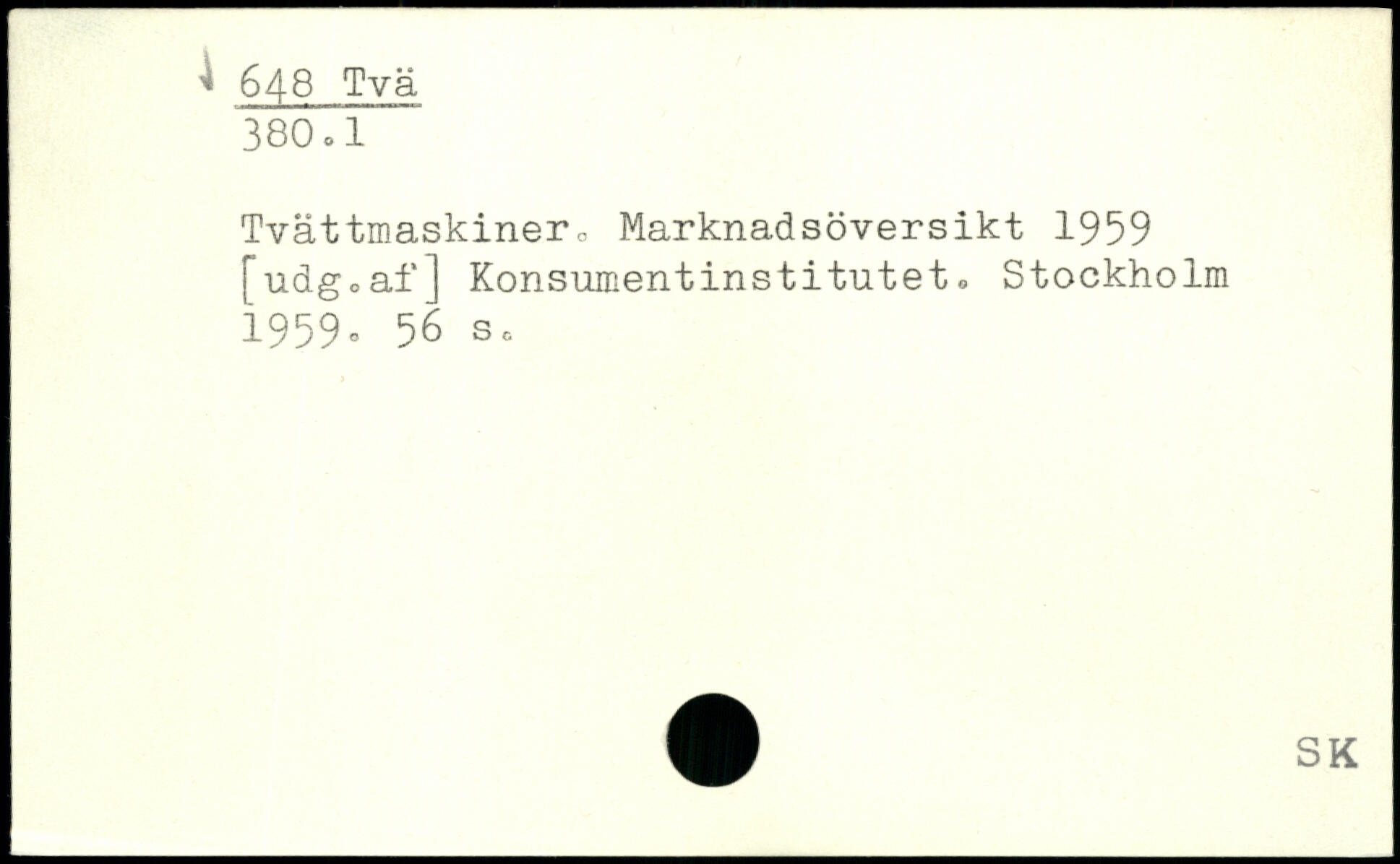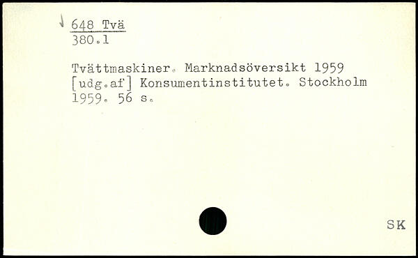 Tvättmaskiner., Marknadsöversikt 1959 [udg.af] Konsumentinstitutet.