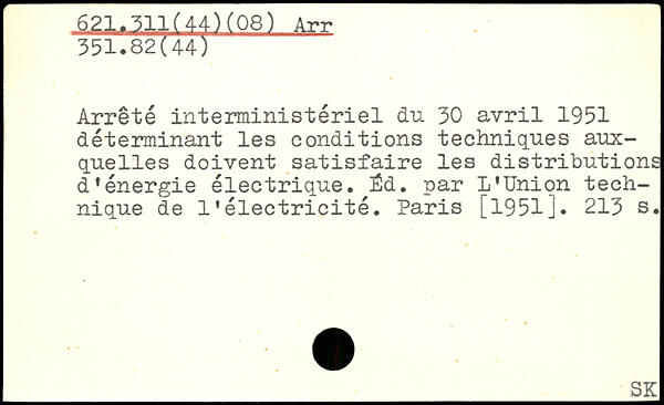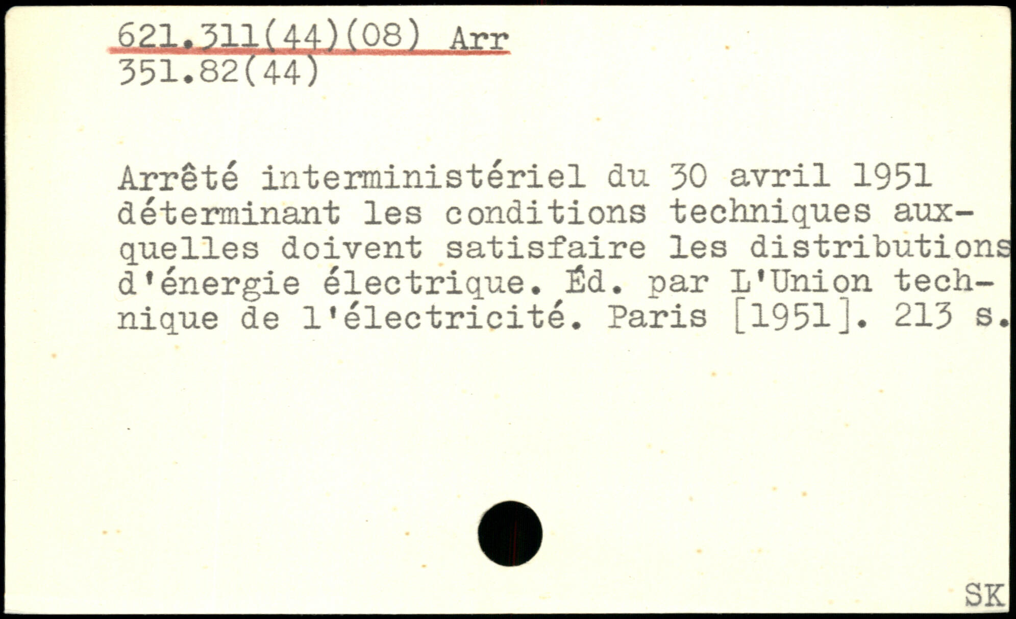 &ls2ULM)[oa) Av? 351.82(44) Arrêté interministériel du 30 avril 1951 déterminant les conditions techniques auxquelles doivent satisfaire les distributions d’énergie électrique. Ëd. par L’Union technique de l’électricité.