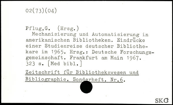 Mechanisierung und Autoraatisierung in amerikanischen Bibliotheken. Eindrücke einer Studienreise deutscher Bibliothekare im 1965. Hrsg.: Deutsche Forschungsgemeinschaf t.