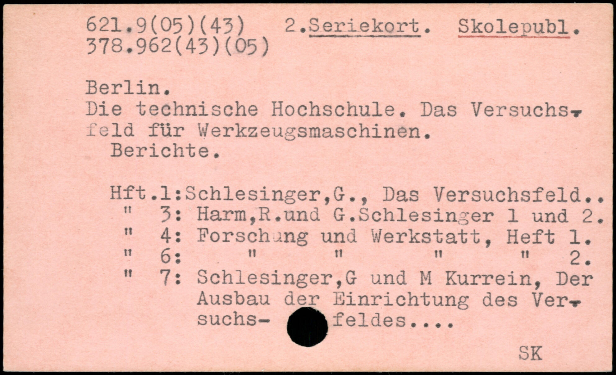 Die technische Hochschule. Das Versuchs, feld für Werkzeugsmaschinen. Berichte. Hft.1:Schlesinger,G., Das Versuchsfeld.. 3: Harm,R.und G-.Schlesinger 1 und 2. ” 4: Porschang und Werkstatt, Heft 1. n g. t! tl H tl 2 ” 7: Schlesinger,G und M Kurrein, Der Ausbau der Einrichtung des Ver, suchs- ^fcfeldes....