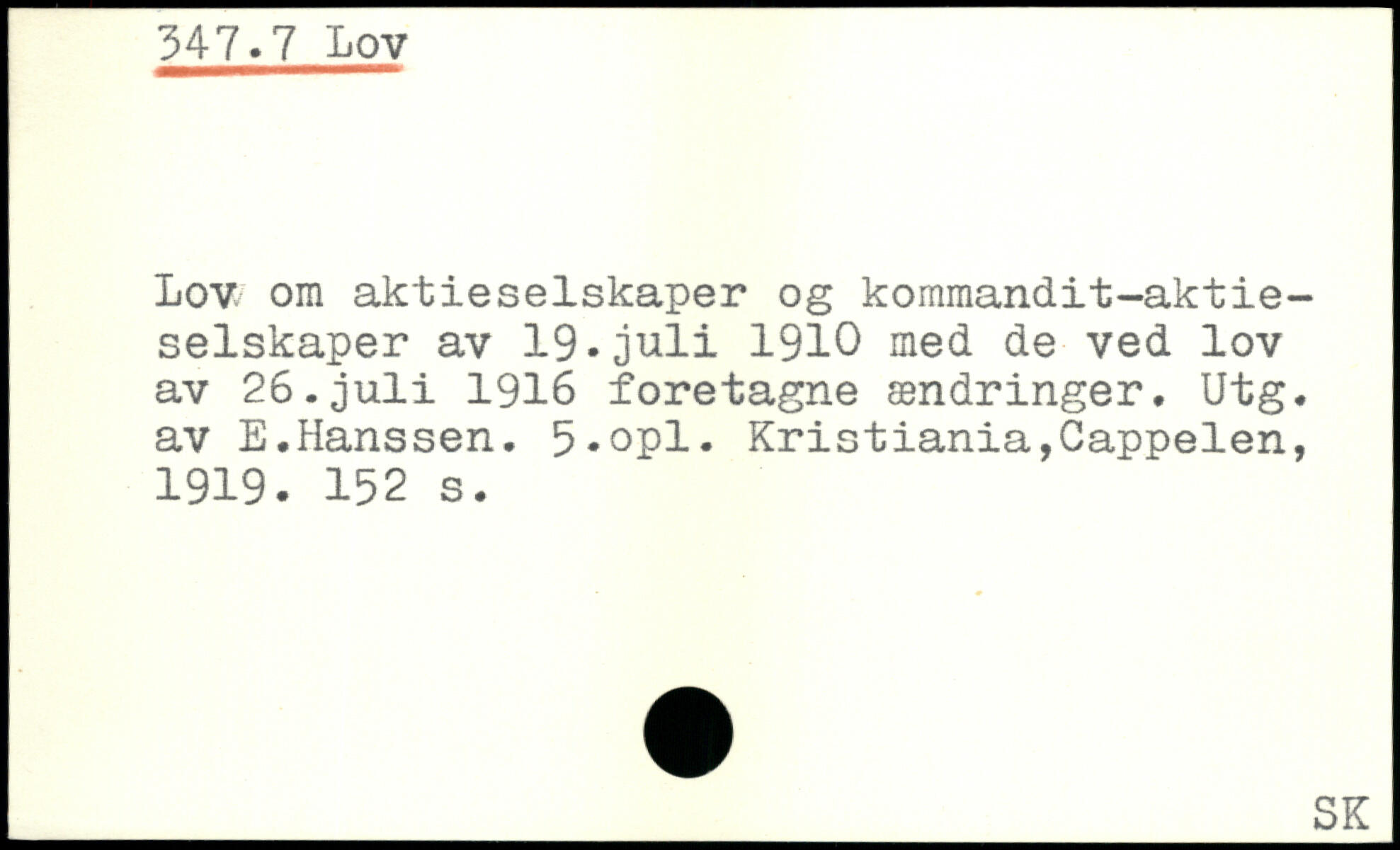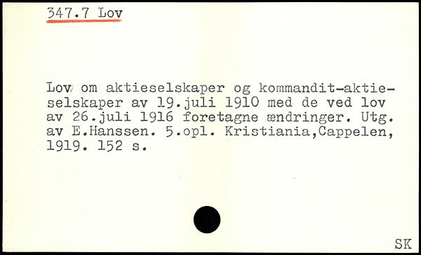 Lov. om aktieselskaper og kommandit-aktie-selskaper av 19.juli 1910 med de ved lov av 26.juli 1916 foretagne ændringer. Utg. av E.Hanssen. 5.opl.