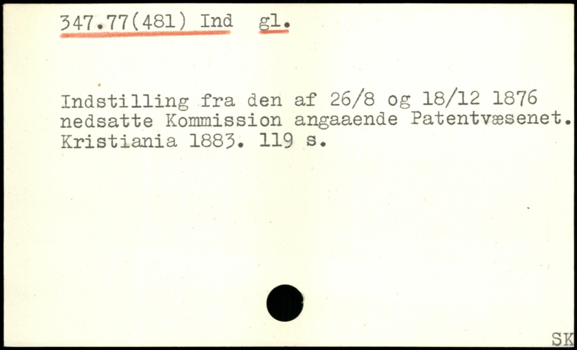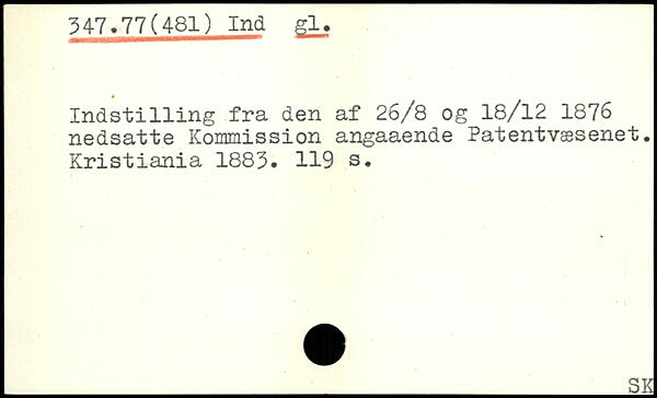 Indst1111ng fra den af 26/8 og 18/12 1876 nedsatte Kommission angaaende Patentvæsenet, Kristiania 1883.