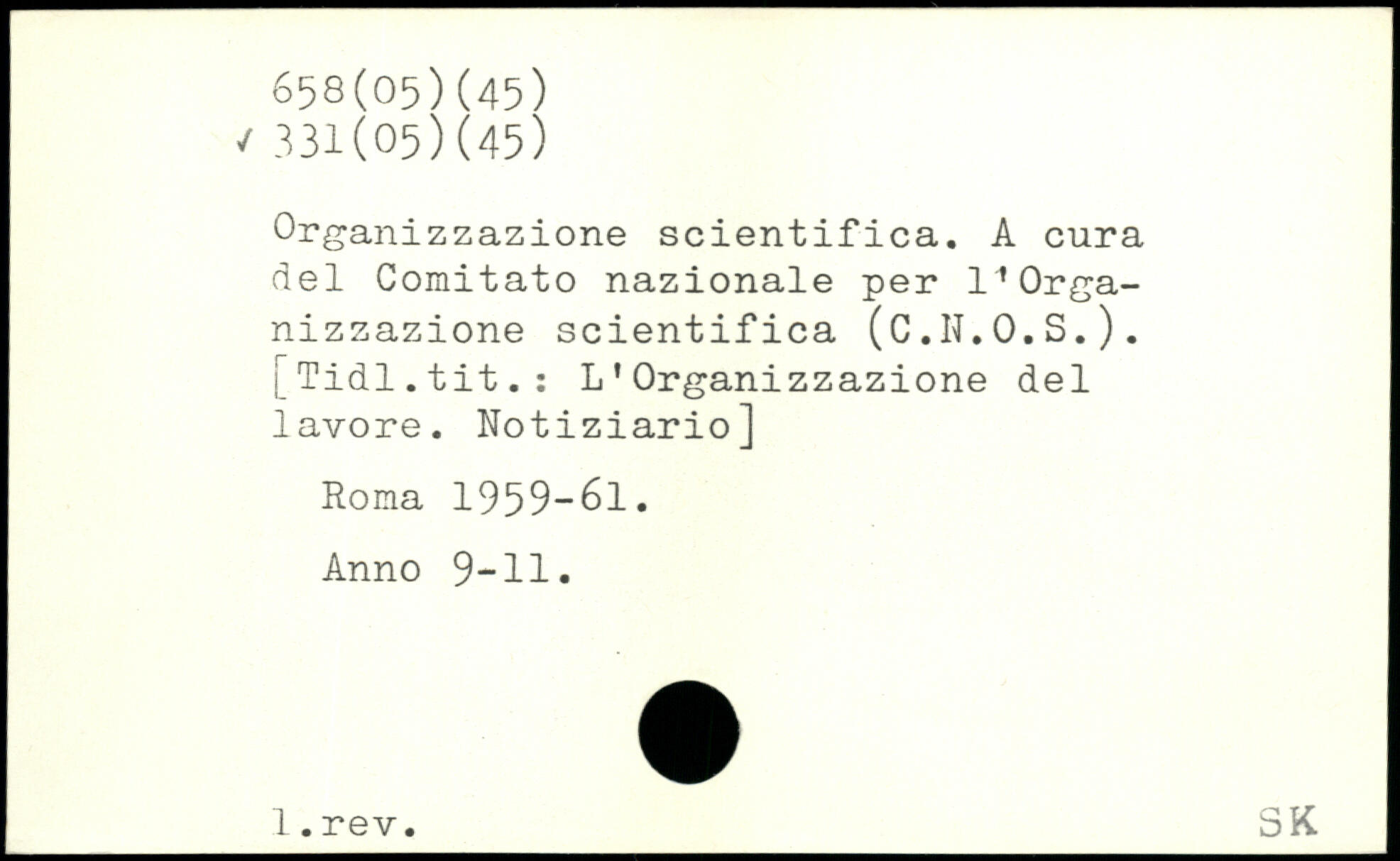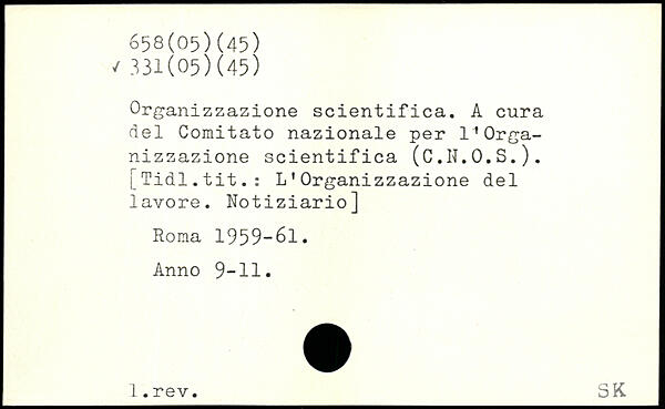 Organizzazione scientifica. A cura del Comitato nazionale per 11Orga-nizzazione scientifica (C.N.O.S.). [Tidl.tit.: L’Organizzazione del lavore. Rotiziario]