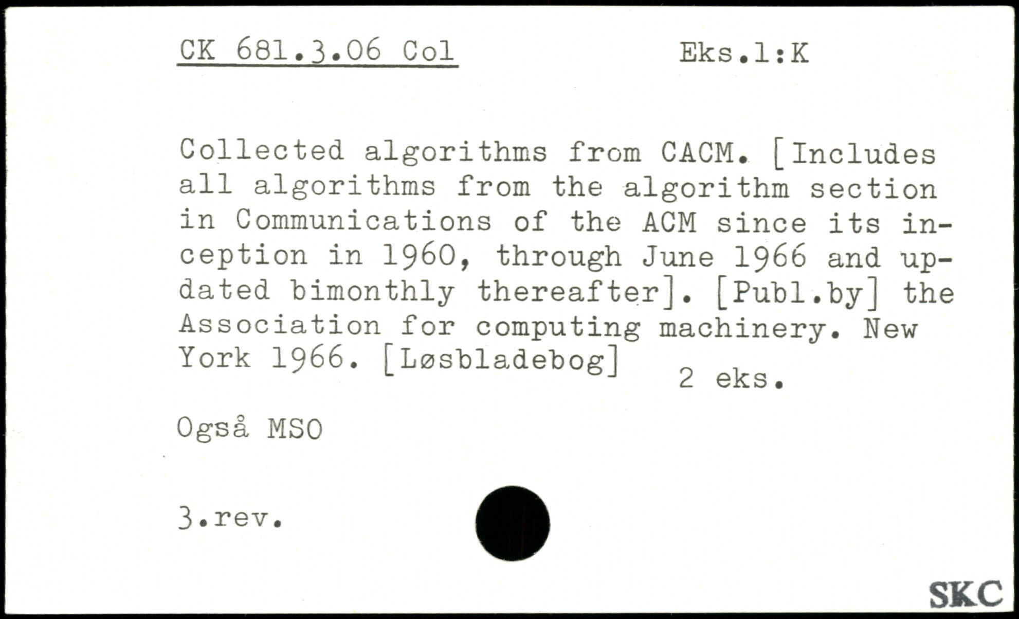 Collected algorithms from CACM. [includes all algorithms from the algorithm section in Communications of the ACM since its inception in 1960, through June 1966 and updated bimonthly thereafter].